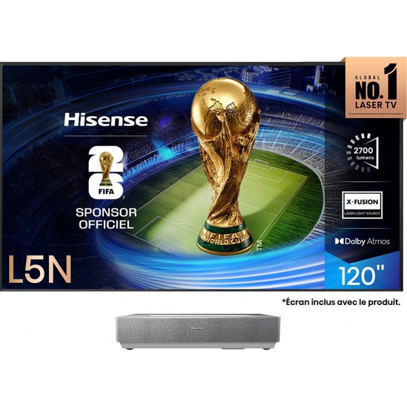 Vidéoprojecteur Home Cinéma HISENSE 120L5ND Laser TV Une Expérience Visuelle Immersive Le vidéoprojecteur home cinéma HISENSE 120L5ND Laser TV offre une expérience visuelle inégalée grâce à sa technologie Laser DLP et sa résolution Ultra HD de 3840×2160. Avec une diagonale de projection de 120 pouces, cet appareil transforme votre salon en véritable salle de cinéma. L&-39 écran anti-reflet de 100 pouces assure une qualité d&-39 image exceptionnelle, même dans des environnements lumineux. La luminosité de 2 700 lumens et le contraste natif de 3000:1 garantissent des images éclatantes et des noirs profonds. Compatible HDR10 et Dolby Vision, le 120L5ND restitue des couleurs riches et précises, couvrant 85% du spectre DCI-P3. Technologie et Connectivité Avancées Le HISENSE 120L5ND ne se contente pas d&-39 une image parfaite, il propose également une expérience sonore immersive avec sa barre de son intégrée de 2x20W et sa compatibilité Dolby Atmos. Profitez d&-39 une connectivité sans fil complète grâce au WiFi, Bluetooth et AirPlay2, facilitant le partage de contenus depuis vos appareils mobiles. La Smart TV intégrée, propulsée par Vidaa, offre un accès direct à vos applications préférées comme Netflix, YouTube et Prime Vidéo. Avec ses multiples connectiques, dont 3 prises HDMI et 2 ports USB, ce vidéoprojecteur s&-39 adapte à tous vos besoins multimédias. Son design compact et sa fixation murale incluse permettent une installation facile et discrète. Produit neuf dans son emballage d'origine bénéficiant de la garantie originale du fabricant. EAN 6942351409511.