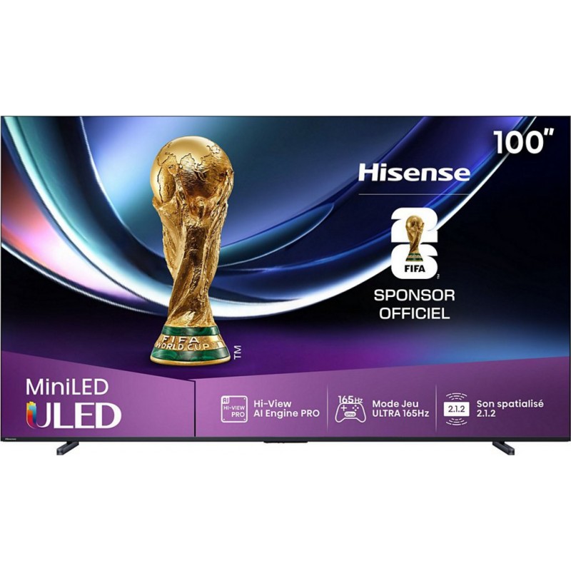 Hisense TV Mini Led 100U7Q PRO 2025 (253cm). Produit neuf dans son emballage d'origine bénéficiant de la garantie originale du fabricant. Vidéo. Marque Hisense. EAN 6942351417738.