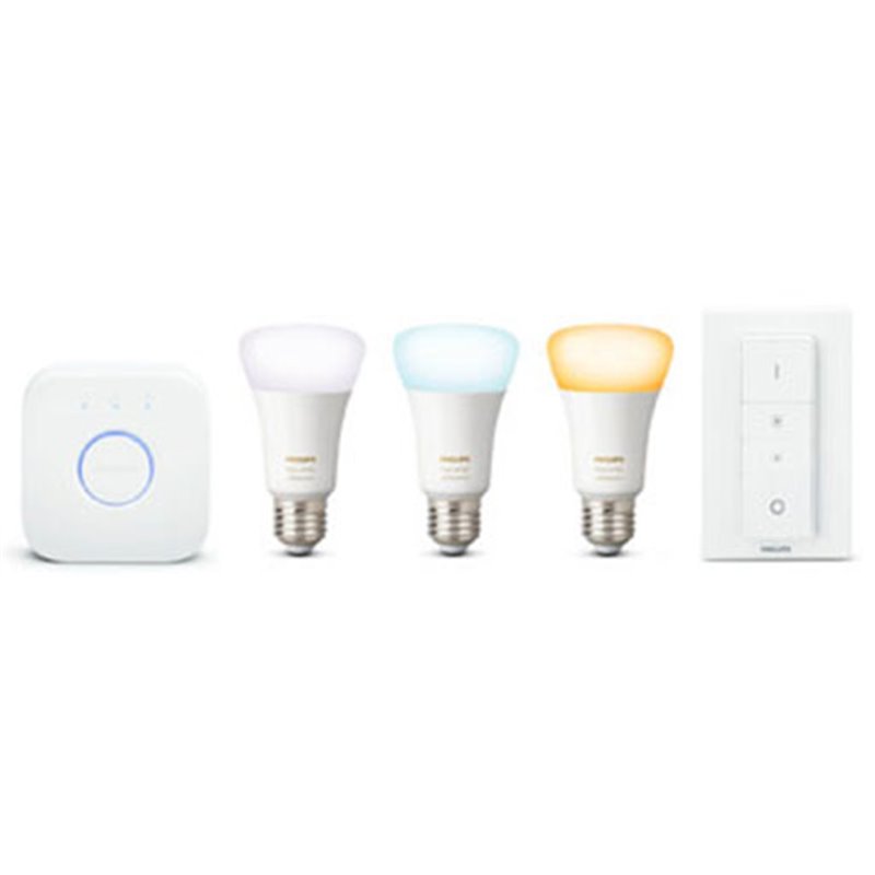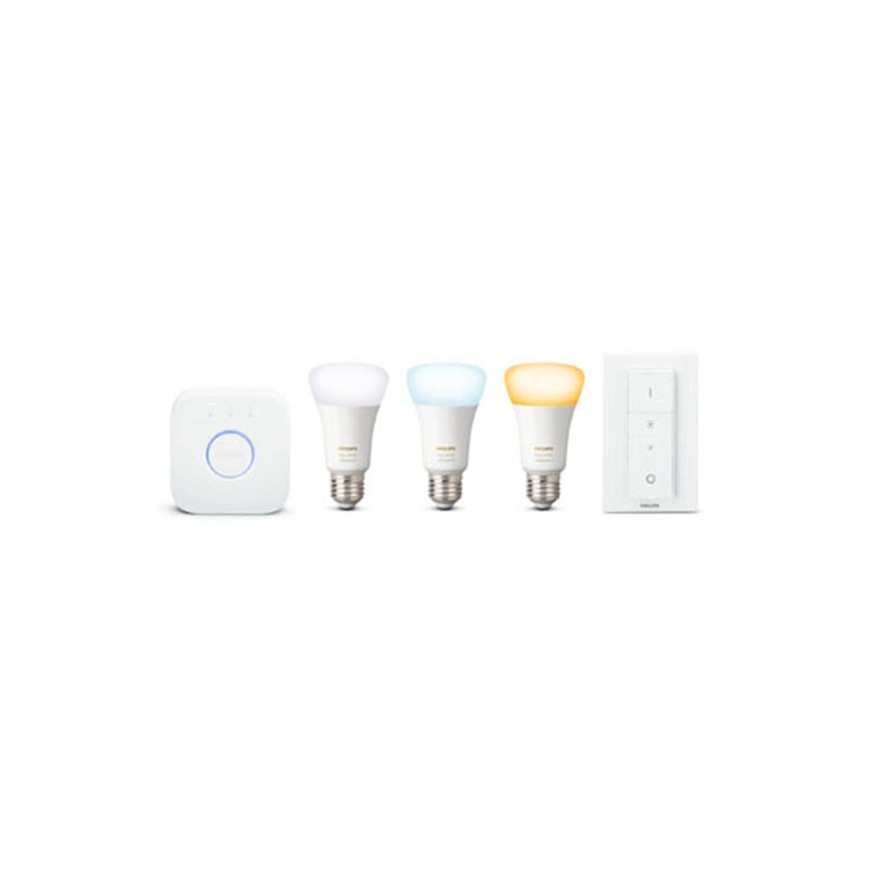 Pack Philips démarrage E27 Hue white & ambiance. Offre spéciale avec extension de garantie à 3 ans. Envie de changer les couleurs de votre intérieur sans forcément repeindre tous les murs " Voilà qui est à la portée du système HUE de PHILIPS qui, depuis 2012, propose une gamme d'éclairages connectés qui vous laissent tout définir de vos ampoules : l'intensité, l'automatisation, les couleurs... même quand vous n'êtes pas là! À domicile, appuyez sur un interrupteur et les ampoules s'allumeront naturellement, d'une lumière entre le jaune et le blanc. D'apparence, le système d'éclairage HUE de PHILIPS se compose d'ampoules classiques. C'est en passant par votre application depuis votre smartphone ou ordinateur que vous changerez les choses. Elle vous permet en effet d'allumer et d'éteindre toutes vos lampes à distance, mais aussi d'en régler l'intensité lumineuse et la couleur. Type d'ampoule : Ampoule connectée Pack de démarrage : Contient le pont Philips, trois lampes connectées et un variateur Douille : E27 (grande à visser) Classe énergétique : A+ Nombre ampoule : 3 Durée de vie : Jusqu'à 25 000 heures Coloris de l'ampoule : Blanc Eclairage : Blanc à intensité réglable Gamme Philips Hue : White Ambiance Environnement : Apple Home Kit Compatible assistant vocal : Alexa et Google Assistant Livré avec : Pont, câble réseau Ethernet, adaptateur secteur, variateur, 3 ampoules (matériel neuf non déballé, garantie totale 3 ans).