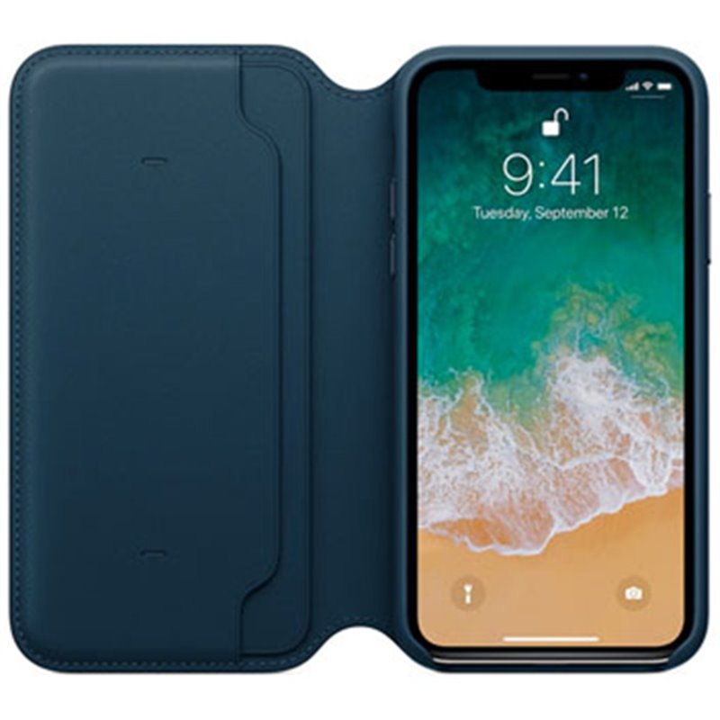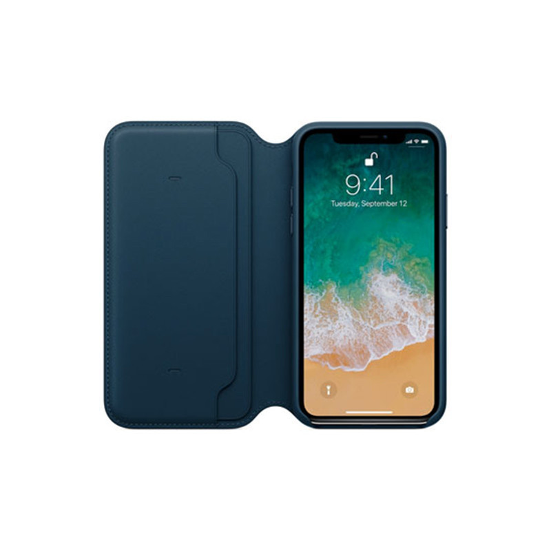 Étui folio en cuir pour iPhone X - Bleu cosmos [référence Apple MQRW2]. Taillé sur mesure dans un cuir européen au tannage et à la finition uniques pour offrir une réelle sensation de luxe, l'Etui folio en cuir pour iPhone X épouse les courbes de votre iPhone sans en compromettre la ligne. Ouvrez-le, et votre iPhone X s'éveille. Refermez-le, et il retourne en veille. A l'intérieur, une doublure en microfibre douce renforce la protection tandis qu'un espace dédié vous permet de ranger billets, reçus et plusieurs cartes. Et vous pouvez le laisser sur votre appareil en permancence, même durant la recharge sans fil. (matériel neuf, garantie totale 1 an). EAN 0190198522559.