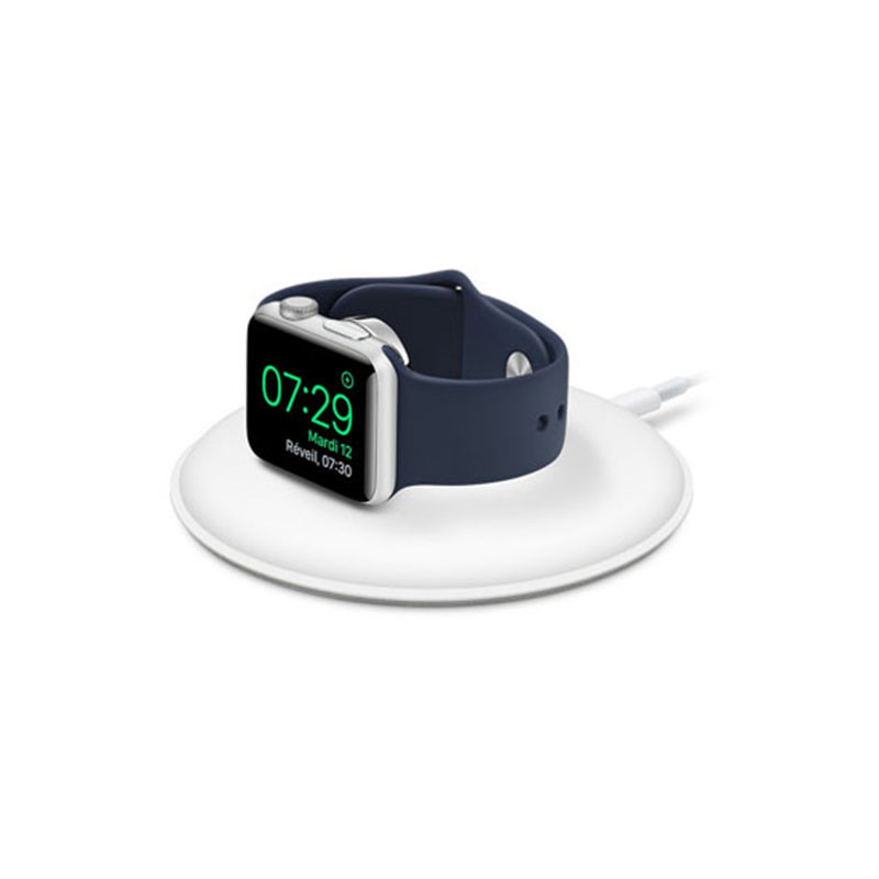 Station de charge magnétique pour Apple Watch [référence Apple MLDW2]. Cette station de charge magnétique permet de recharger votre montre Apple Watch. Elle passe automatiquement en mode Table de nuit lorsqu'elle est placée sur le côté pour servir de réveil. Doté du même connecteur de charge par induction que la montre, la station est adaptée pour les modèles 38mm et 42mm. Elle se connecte via un câble Lightning vers USB ainsi qu'un adaptateur USB de 5W. Diamètre 104 mm Hauteur 12,1 mm Contenu du coffret : - Station de charge magnétique pour Apple Watch - Câble Lightning vers USB (Apple Watch vendue séparément) (matériel neuf, garantie totale 1 an). EAN 0888462655880.